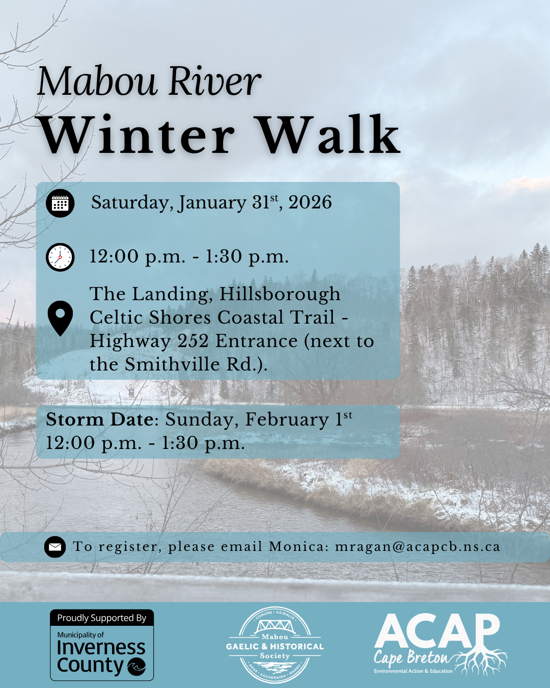 ACAP Cape Breton, the Municipality of Inverness County, and the Mabou Gaelic and Historical Society are hosting a winter watershed walk! This walk will focus on local history, tree ID, and some track identification.