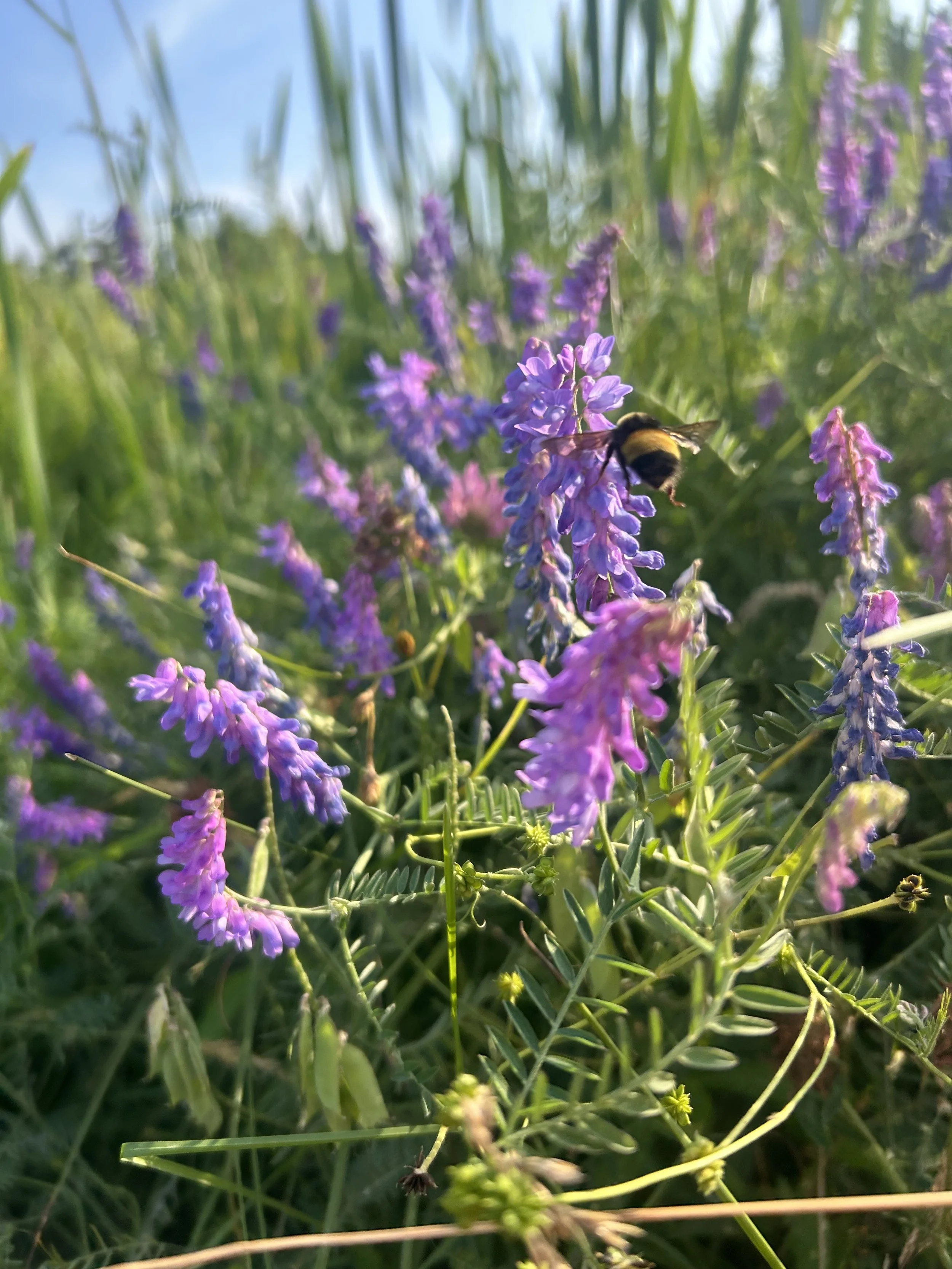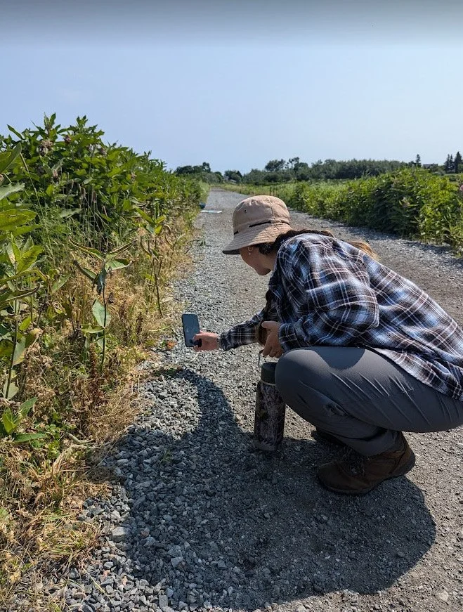 Our research occurs in meadows, fields, roadsides, and wetlands across Cape Breton. To learn more about the bumble bees present at our field sites, we use catch-and-release research methods to quickly identify what species of bumble bees are present. Our monarch monitoring program looks a little different as we use observational research methods to learn more about monarchs (larvae and adults) and milkweed present at various field sites. For all our pollinator monitoring, we catalogue plant species at each site and note the different flowers on which we find bees and monarchs foraging (eating).